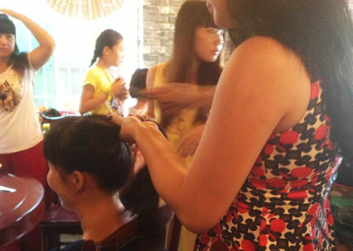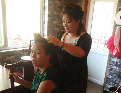 玩美化妆班学员为参赛选手化妆造型过程中